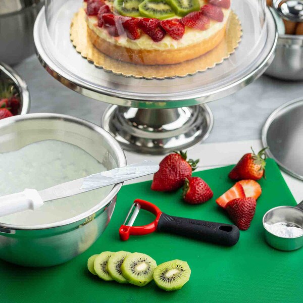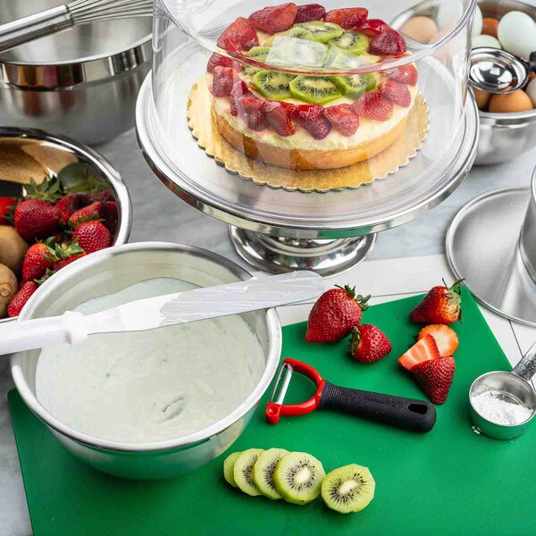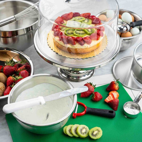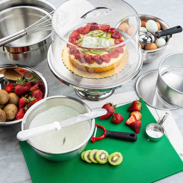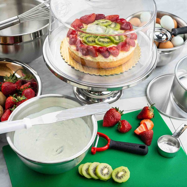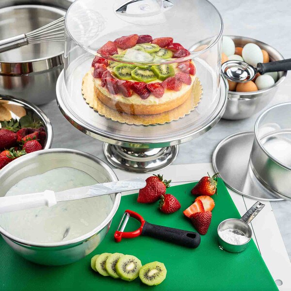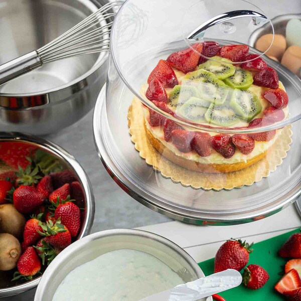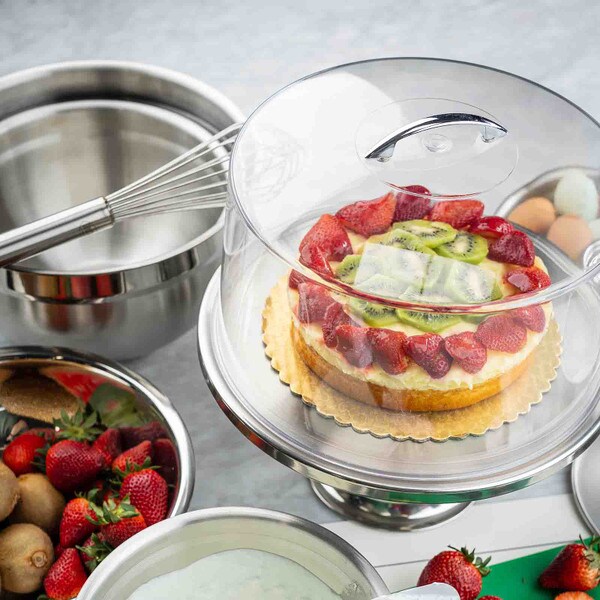 Show off the quality and freshness of your playfully decorated cakes, pies, cupcakes, and muffins with this attractive cake plate. The eye catching, non-revolving cake plate provides excellent product visibility. Set includes cake stand and cover.