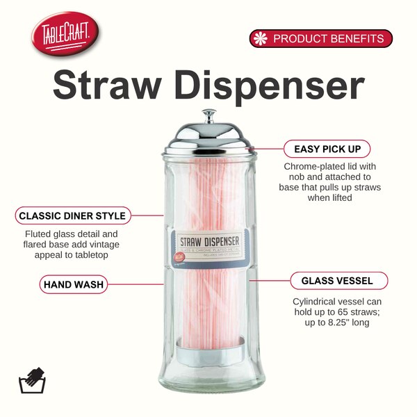 This glass countertop straw holder is cylindrical in shape, and has a chrome-plated lid, which attaches to the metal base inside the straw holder, and pulls up the straws when the lid is lifted. This straw holder can store wrapped and unwrapped straws. It will accommodate straws up to 8 1/4" long. 60 straws included (US only).